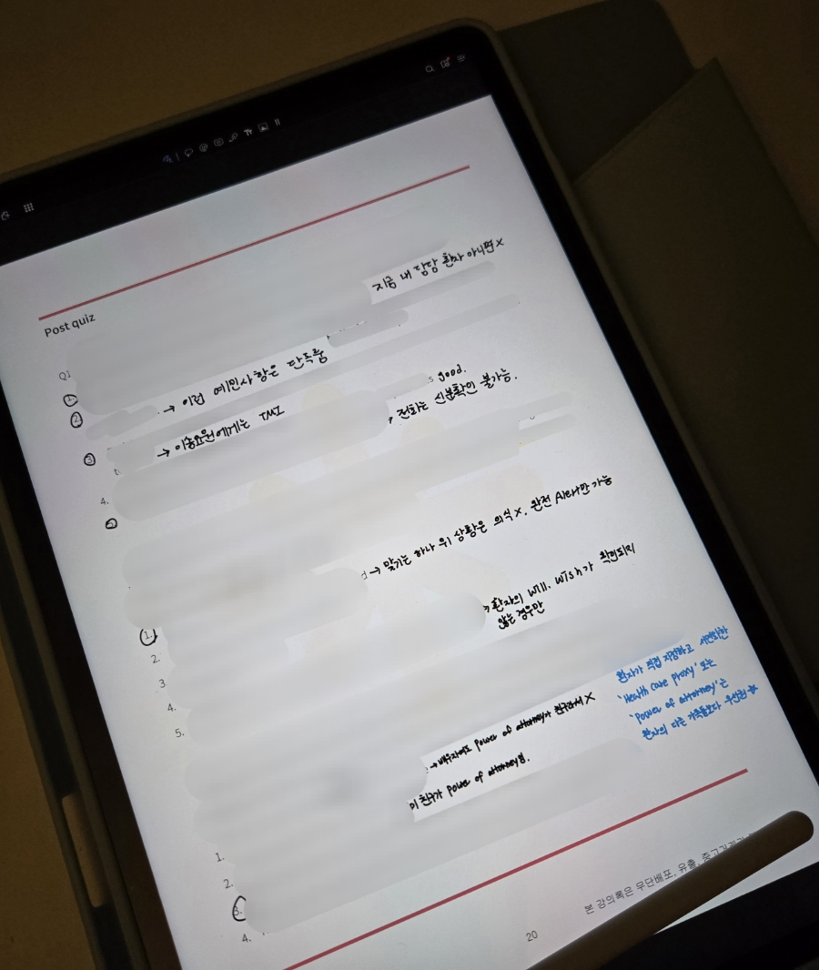 또한 밑에 사진은 실제 강의를 들으며 내가 교재에 필기한 사진인데 강의에서 답만 알려주고 넘어가는 게 아니고 정답이 왜 정답이며, 오답이 왜 오답인지 선택지 하나하나를 다 설명해 주고 시험의 포인트를 잘 설명해줘서 첫 강의 수강 후 드림널스에 대해 신뢰도와 호감도가 상승하였다.(문제와 보기 내용은 저작권 문제로 블러처리 하였다)