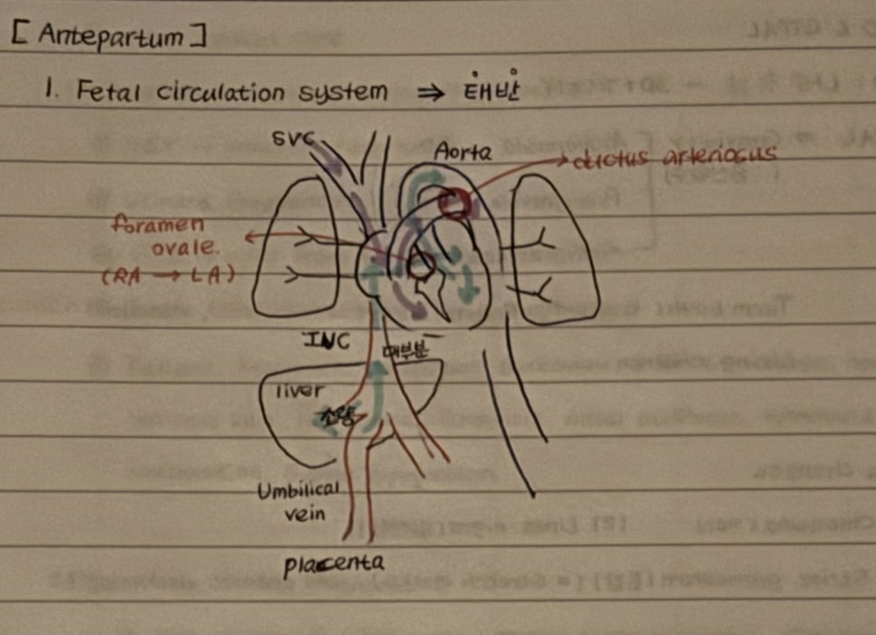 - 태아순환에만 존재하는 포인트 : foramen ovale(난원공), ductus arteriosus(동맥관)