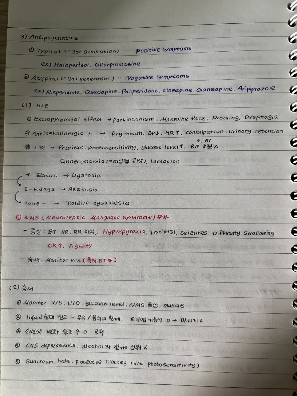 [증상] - V/S 변화(BP, HR, RR, BT) - Hyperpyrexia - fatigue - LOC 변화 - seizures - skeletal muscle rigidity - difficulty swallowing - CK 수치 상승 [중재] - Monitor LOC, 전해질 수치, V/S (특히 BT) -Med 중단할 준비 -처방된 해열제 투약 및 체온 낮추기 위한 조치 |