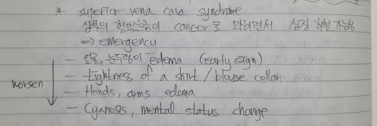superior vena cava syndrome, 상부의 혈액흐름이 cancer로 막히면서 심장 허혈 가능성이 있으므로