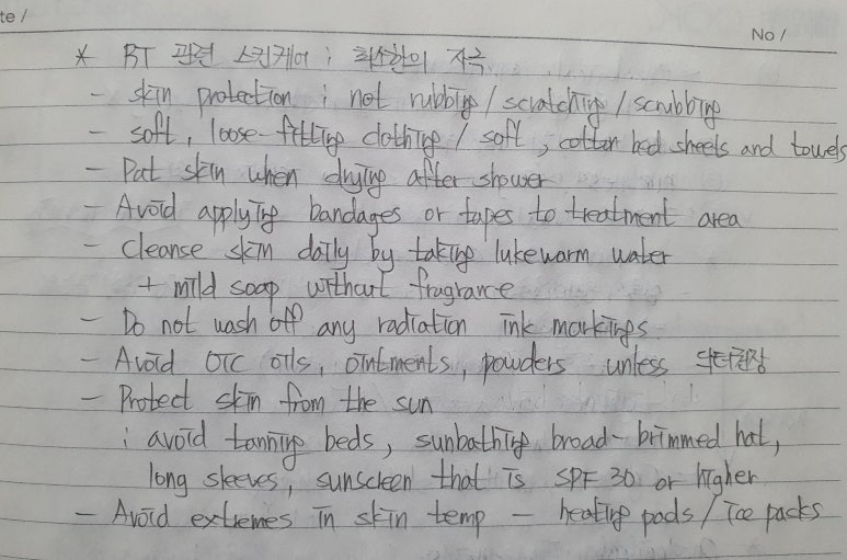 정답으로 고를 가능성이 높으나, 항상 주의해야할 것은, RT환자 피부는 굉장히 민감하므로