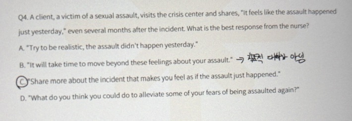 당연히 상황에 대해 현실적으로 알려주는 B가 정답이라고 생각했다.. B는 치료적 대화가 아니라 오답, C는 문제 상황이 무엇 때문에 일어나는지 파악하는거라 답은 C란다.. 증말 어렵습니다.. 저는 B가 clarifying 인 줄 알았어요