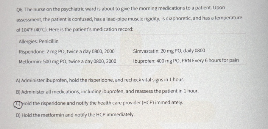 NMS = 도파민 급감이니까 조현병 치료약물 복용중이겠고요, 일단 복용 약물부터 중단하고 전신증상에 대한 대처 필요하니 도움 청해야겠죠? 그래서 답은 C.risperidone 중단하고 의료진에게 알리기! 사실 meformin이 익숙한 약이라 C로 골랐는데 다른 정신과 관련 약물이였으면 분명히 찍었을 문제ㅠ