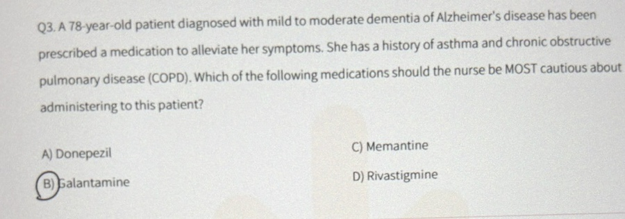 치매 진단된 환자에게 약물 처방됬는데 asthma랑 COPD 있대요. 호흡기 관련해서 주의할 약물= B.galatamine