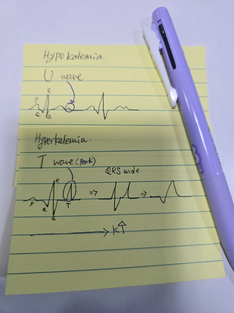 K가 이수치나온것도 처음보고 그걸로 인한 arrest 상황을 처음 본 저는 또 어느날 K수치가 오름에 따라 EKG가 어떻게 변화하는지 영상으로 본적이 있어요