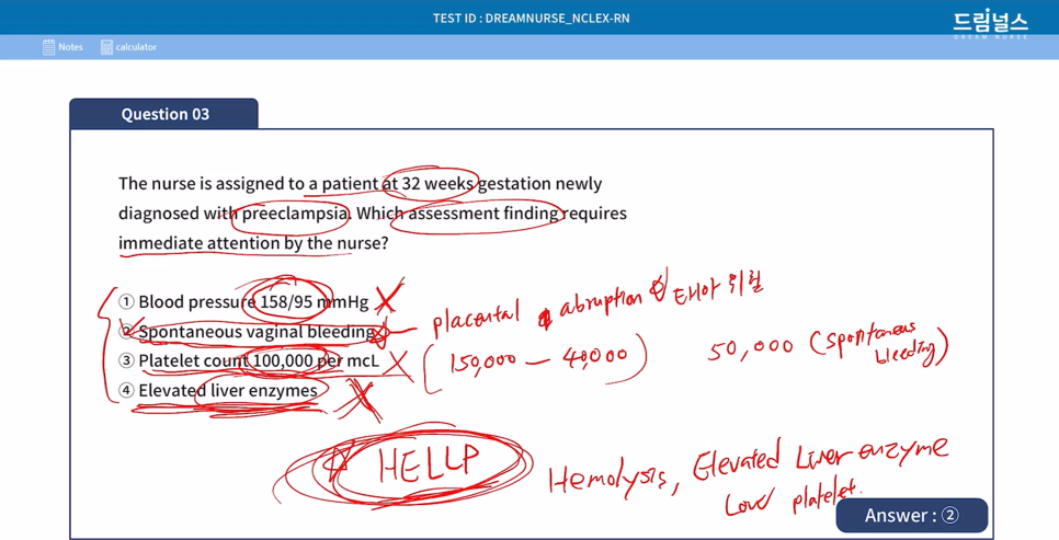 여기서 가장 심각한 증상인 HELLP(Hemolysis, Elevated Liver enzyme, Low Platelet)이 기억나 답을 4번으로 골랐습니다.