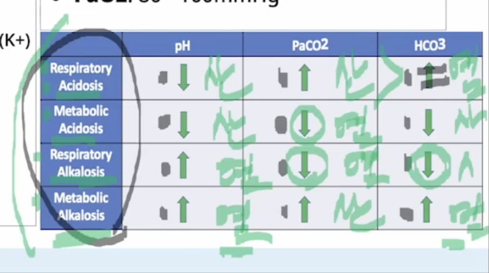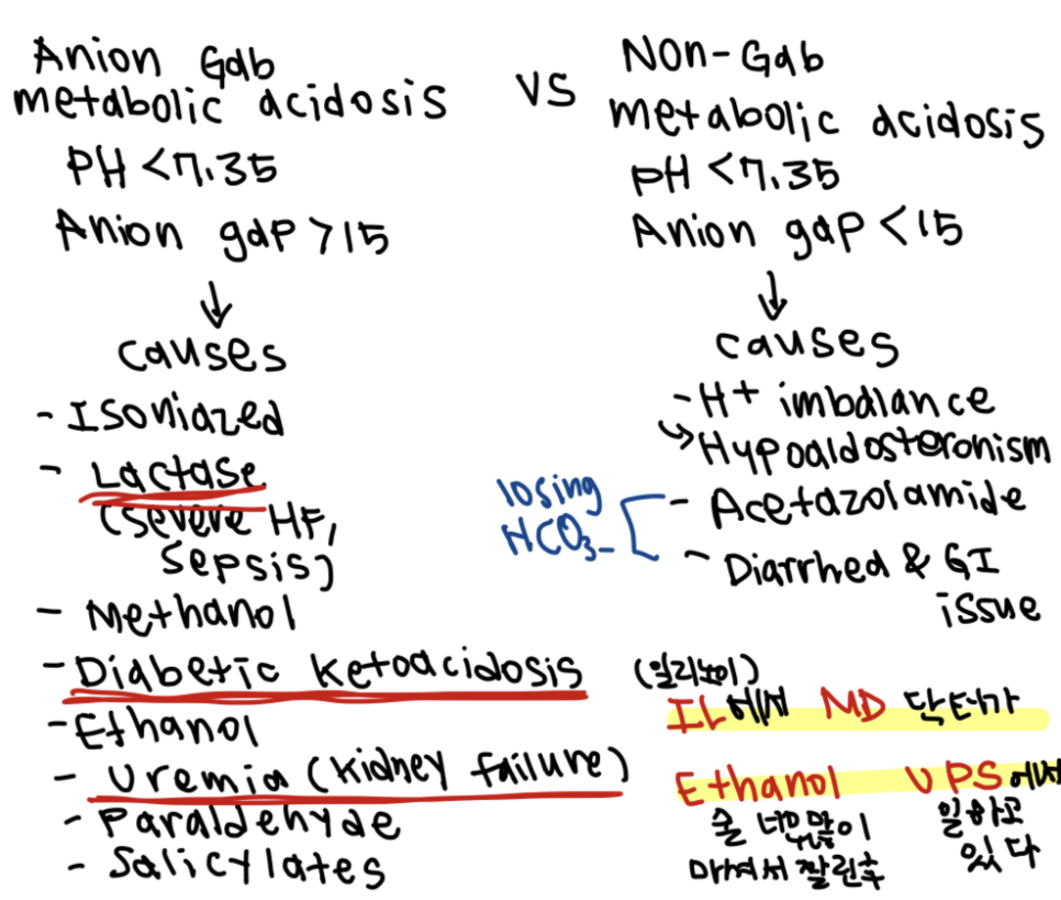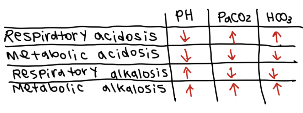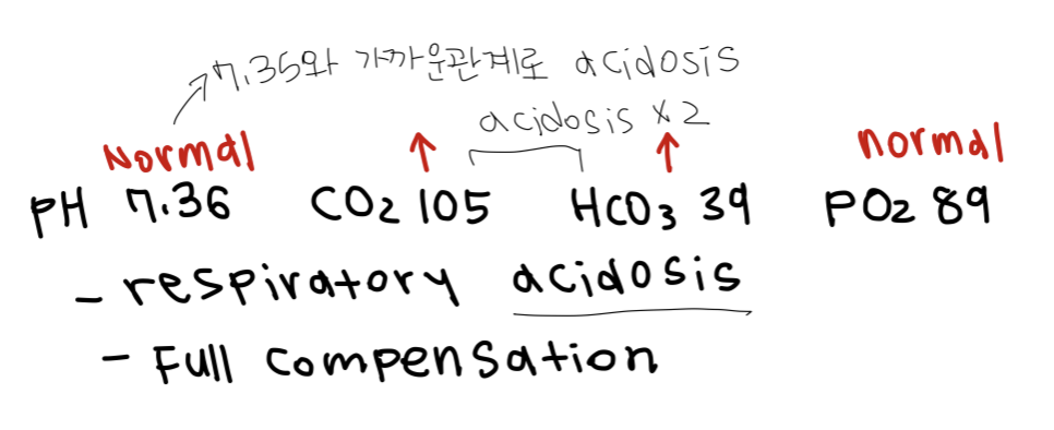 * PaCO2가 정상수치가 아닐때는 respiratory와 연관이있고 (respiratory acidosis vs respiratory alkalosis) HCO3의 수치가 문제가있다면 metabolic와 연관이있다 (metabolic acidosis vs metabolic alkaosis)