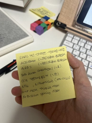 특히 RAAS 시스템을 다시 제대로 이해하게 된 게 가장 큰 수확이었어요. 혈압이 떨어지면 레닌이 분비되고, 안지오텐신과 알도스테론, 항이뇨호르몬이 작용하면서 혈관을 수축시키고 수분과 나트륨을 보유해서 혈압을 올린다는 흐름을 다시 잡으니까, 왜 ACE 억제제나 ARB가 혈압을 낮추는지 자연스럽게 연결되더라고요.
