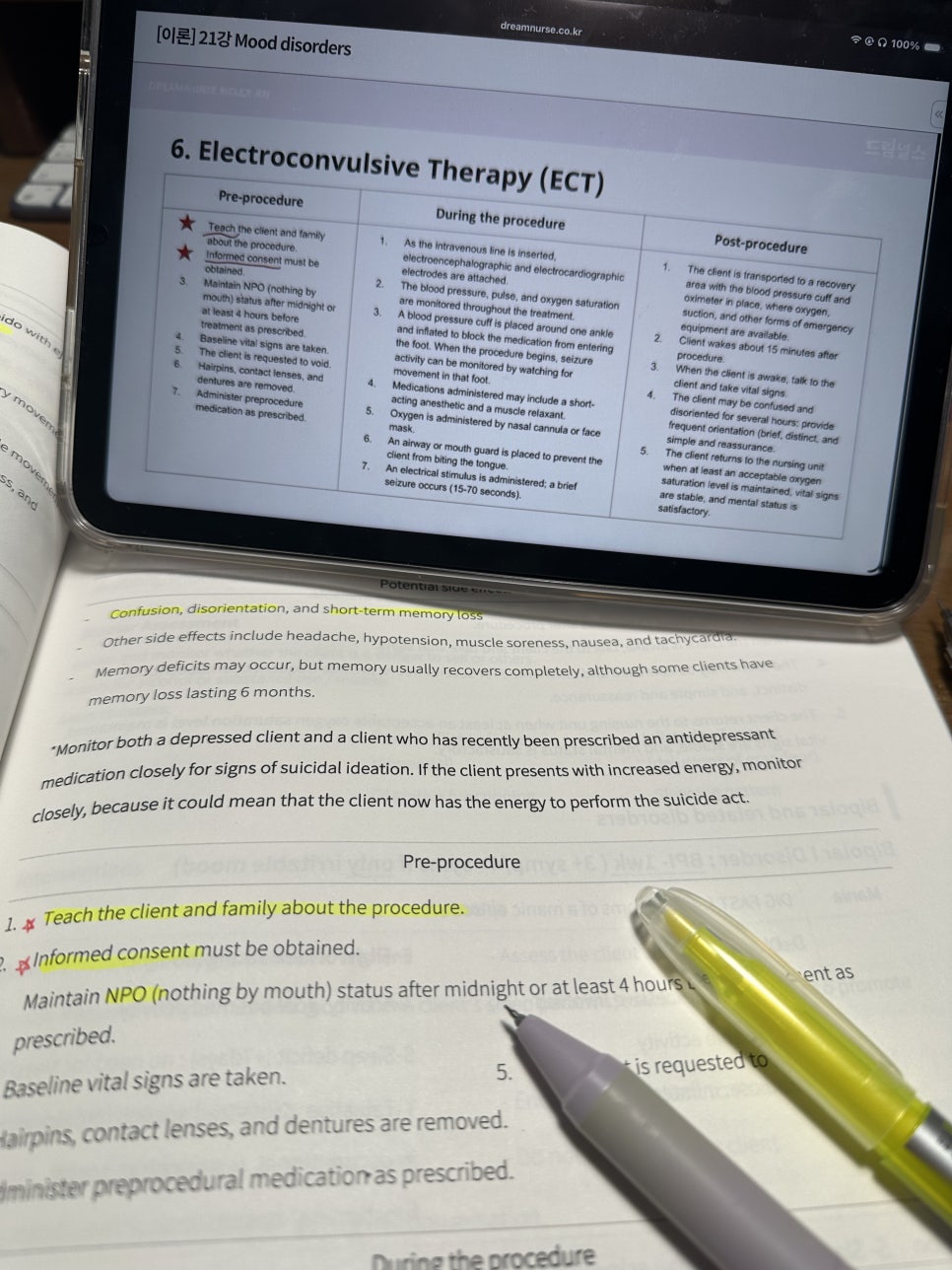 4주차 드림널스 엔클렉스 강의는 솔직히 말해 양도 많아지긴 했지만 걱정도 들었던 나에게 좀 위로(?)가 되었던 파트였다. 정신간호 부분을 공부하면서 어느정도 예상을 했던 것은 정신간호에서 다루는 중요한 병들이 많고, 그에 따른 중재나 간호 등의 특징들도 그만큼 많다는 것이었다. 그래서 사실 강의에 들어가기 전에도 부담감을 느꼈던 것도 사실이었다. 강의를 들으면서도 그 양이나 내용을 공부하는 과정이 그 예상들에 어느 정도 들어맞는 부분들도 있었지만 제공된 강의자료나 강의처럼 정리를 하지 않고 혼자서 공부하기 힘들었을 수 있었을 것이다. 이번에도 선생님께서 경험하신 임상에서의 이야기를 통해서 지루해질 수 있는 수업이 흥미로웠고, 그에 따라 내용도 더 쉽게 기억에 저장할 수 있었다. 이 다음으로 처음 이번주부터 시작한 아동간호학 부분에서도 선생님의 정리가 깔끔하게 되어있어 이해에 도움이 되었다고 생각한다. 특히 많은 정보가 있는 시험에서 꼭 알아야 하거나 외우기 어려운 부분을 선생님께서 외우는 법이라던가 하는 부분을 알려주신 점이 좋았다. 아직은 특히 정신간호학의 여러가지 병과 그것을 문제에 적용하는 것이 익숙치가 않아서 어려운 점이 존재하긴한다. 이는 혼자 복습하고 공부하고, 여러 문제를 풀어보면서 좀 더 나아질 수 있을 것이라고 믿는다. 이번주도 열심히 공부할 수 있게 해준 드림널스에 감사한다.