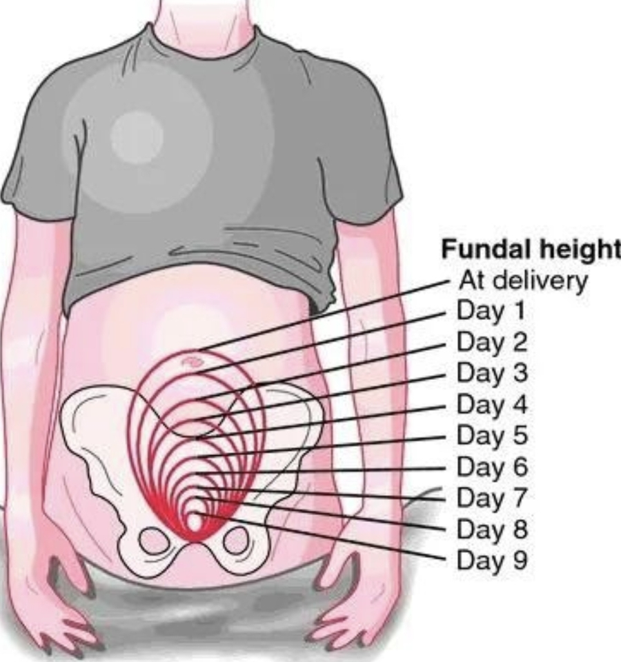 이 과정에서 fundus(자궁 저부)는 매일 약 1cm씩 내려오며, 약 2주 후에는 더 이상 촉지되지 않는다.