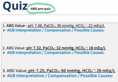 자, 1번은 pH가 높고, PaCo2가 낮고, HCo3가 정상이므로 호흡성알칼리증이며