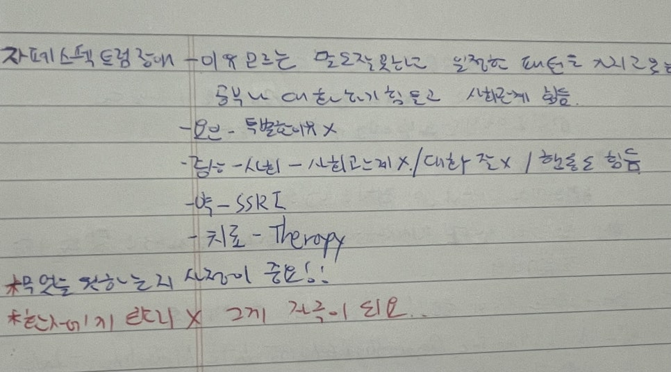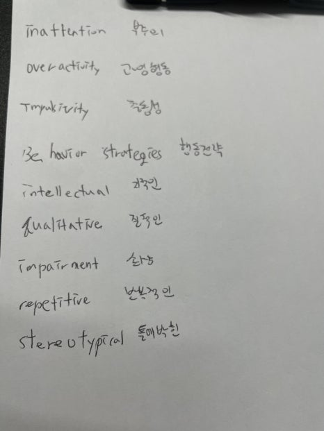 내가 헷갈렸던 부분은 주의력 결핍 과잉 행동 장애 환자에게는 환자가 집중력이 안되니깐 큰소리로 말해서 말에 집중을 할 수 있도록 해야겠다고 생각이 들었다. 근데 강의를 통해서 큰소리는 환자에게 옳지 않은 자극으로 큰소리로 환자에게 말하면 안되다고 다시 인지하게 되었다.