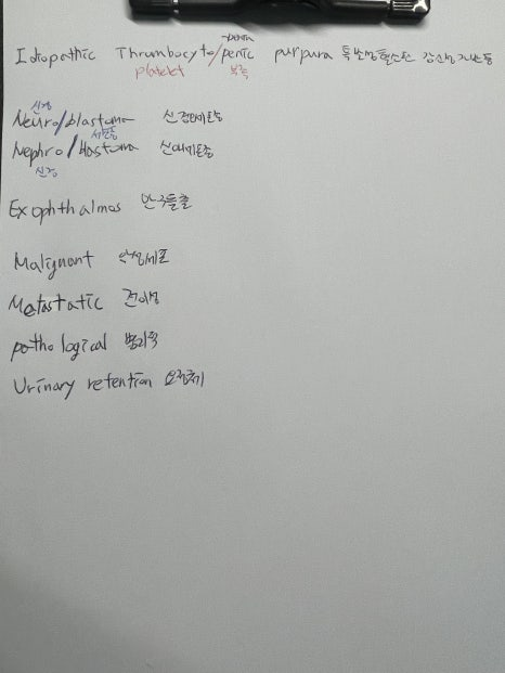 그리고 혈우병과 특발성 혈소판 감소성 자반증이 굉장히 헷갈렸는데 둘다 중재도 비슷하고 치료도 비슷해서 다 출혈 주의라 다른 것이라고는 혈소판 수치와 응고인자 차이라는 점이 굉장히 헷갈렸는데 혈우병은 유전질환이고 특발성혈소판감소성자반증은 자가면역질환이라 아예 원인이 달라서 알고보니 치료도 살짝 차이가 있어서 보니깐 혈우병은 응고인자를 만들어야 되고 특발성혈소판감소성자반증 면역기능 문제라 스테로이드를 줘서 면역을 억제하는것이 치료라는 점에서도 달라서 이제는 판별이 가능하다.